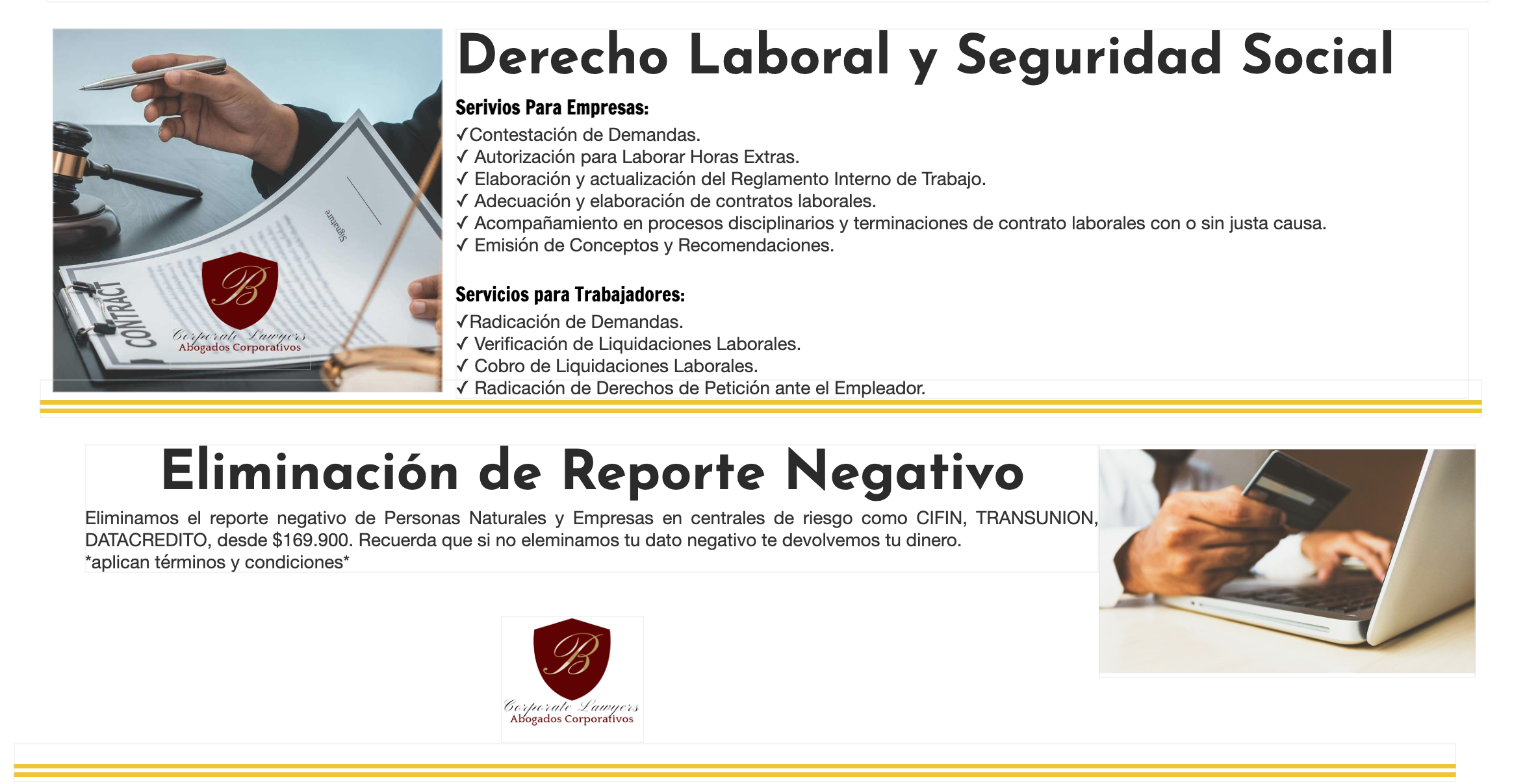 Somos una firma de Abogados ubicada en la ciudad de Bogotá, D.C. con altos estándares de formación especialista en áreas del derecho Comercial, Civil, Laboral y Corporativo. Con profesionalismo ético nos enfocamos en la prestación de servicios de asesoría, consultoría y representación legal en favor de personas naturales y jurídicas del territorio nacional.